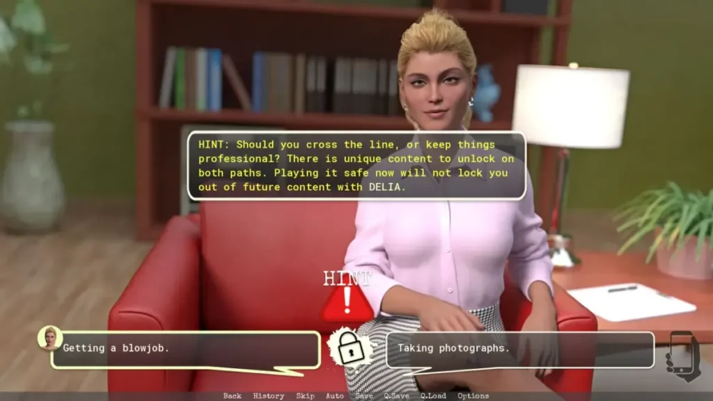 Picture this: You’re in Delia’s office, and the conversation turns to her unconventional methods. The game is practically winking at you here. To unlock the blowjob achievement, you need to follow a specific dialogue thread. When she presents her “alternative therapy,” you must: