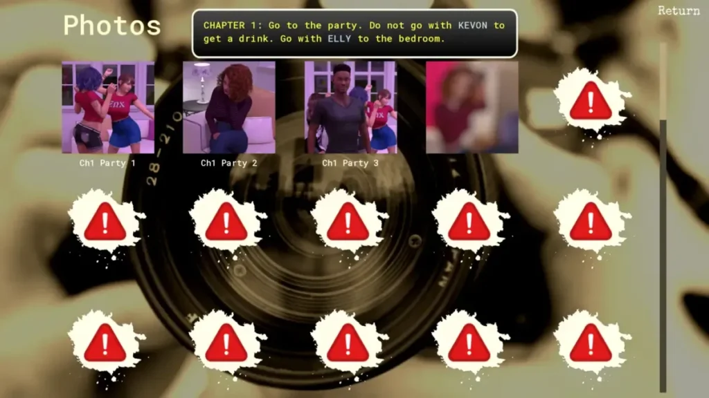 | Cheek to Cheek | Alexis & Sara (Party) | “Peck on cheek” with Alexis -> Make “Cup shot” -> “Talk to Sara” |